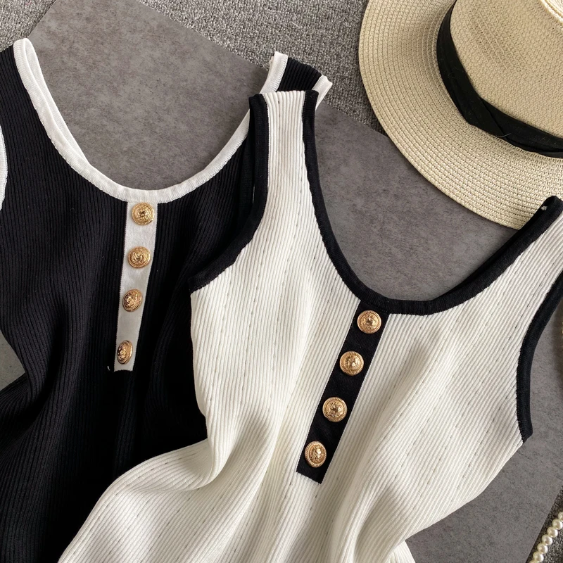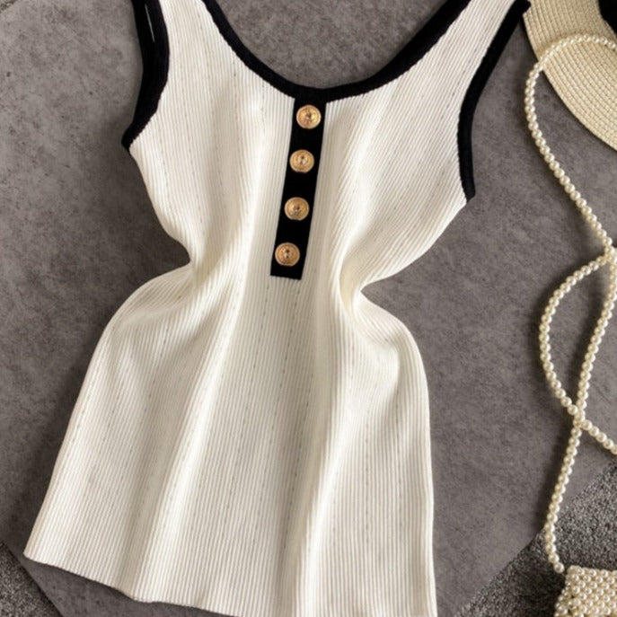Blusa. Sem manga. Regata. Sem estampa lisa. Decote arredondado. Com detalhes em botões no busto.