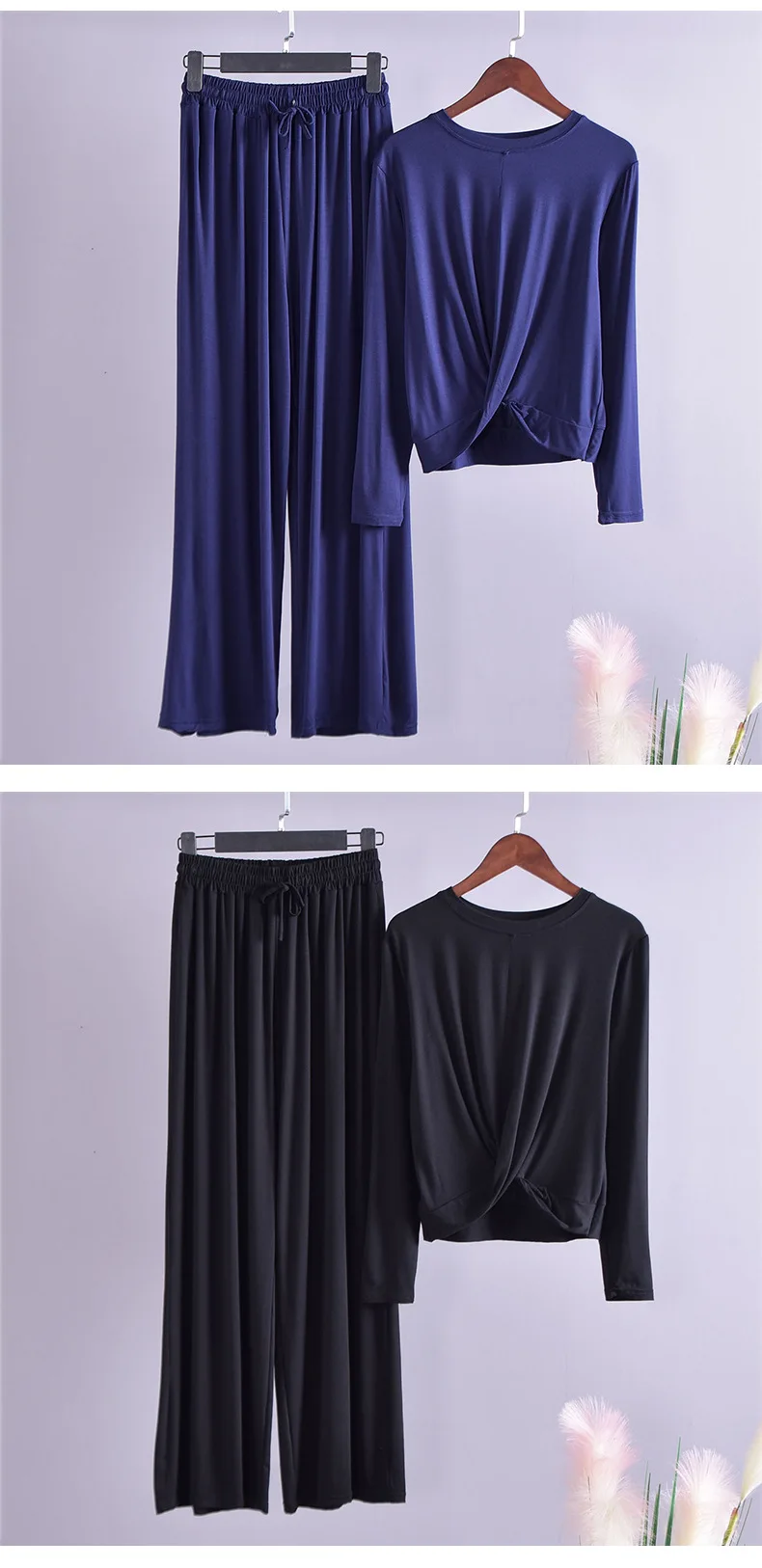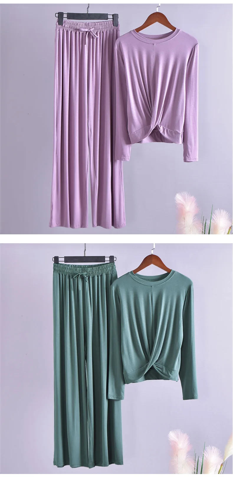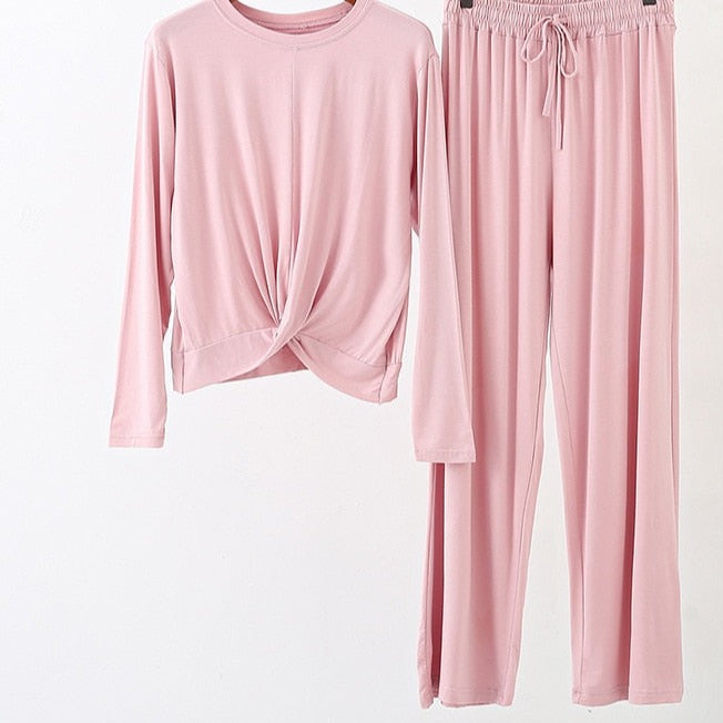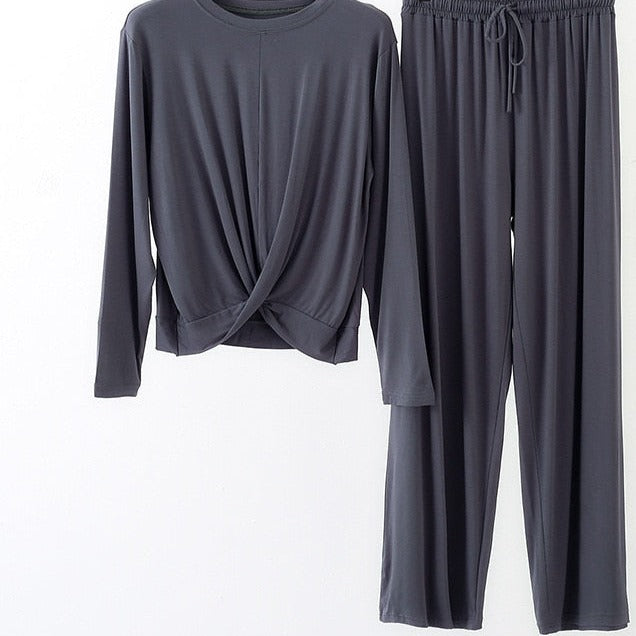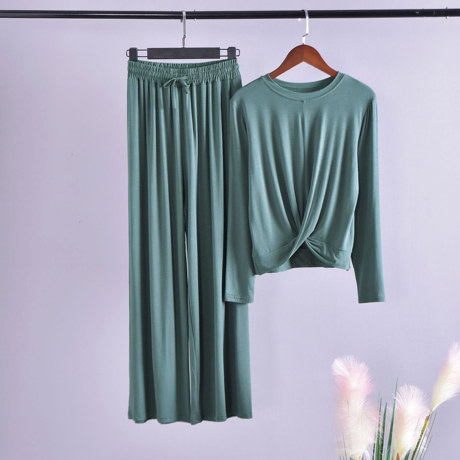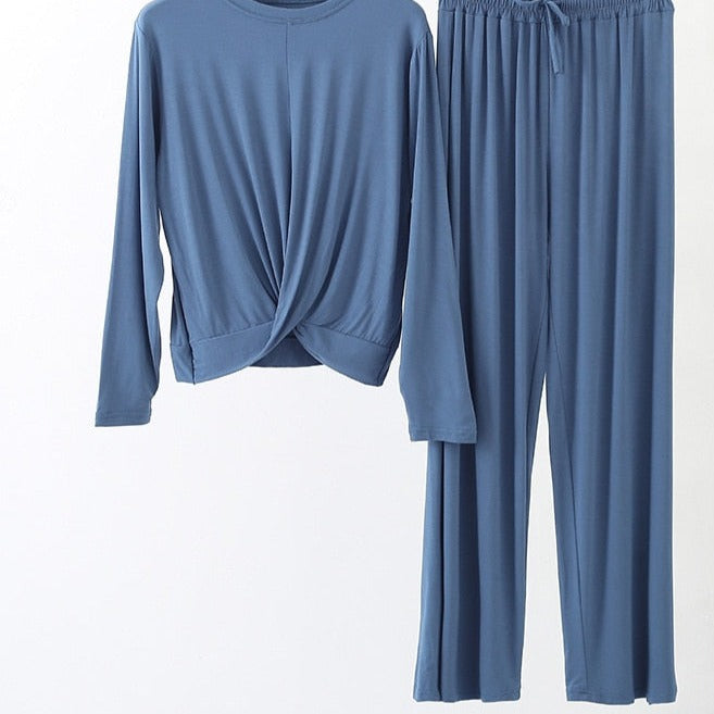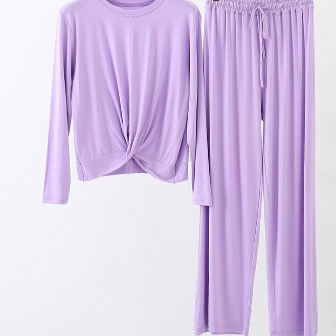 Conjunto com calça e blusa. Blusa com decote arredondado. Transpassado na frente. Modelagem soltinha. Elástico e amarração em cordão na cintura. Sem estampa liso.